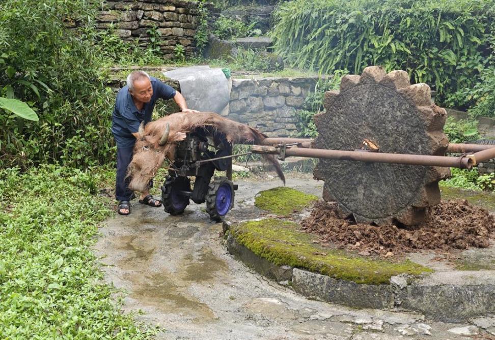 覃师傅用他制作的“铁牛”石磨碾碎原料