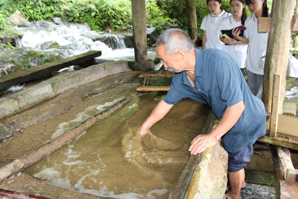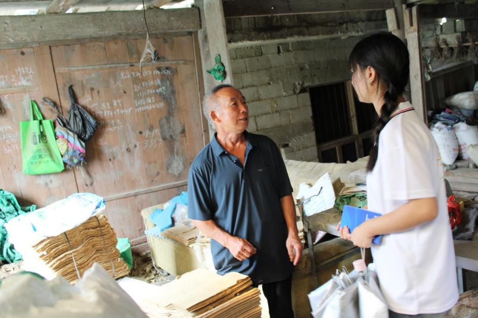 实践团到达非遗传承人覃吴祥老人的家门口,覃师傅热情地邀请实践团师生进入家中作客,并向实践团展示了自己的造纸成品。覃吴祥爷爷耐心地给我们介绍了造纸技艺的家族传承,他说道“古法造纸技艺是从我爷爷那里学过来的,然后传到了我父亲那一辈,接着就到我。我现在已经把技艺传授给了儿子,以后就由他来传承了”。