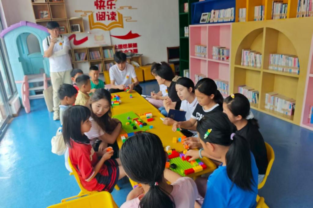 随后,大家在室内开展了堆积木、足球游戏模拟器等室内活动。在堆积木的互动过程中,团队成员与孩子们交流发现,这些孩子多因家庭贫困、父母外出务工或离异等原因,长期缺失完整家庭陪伴。