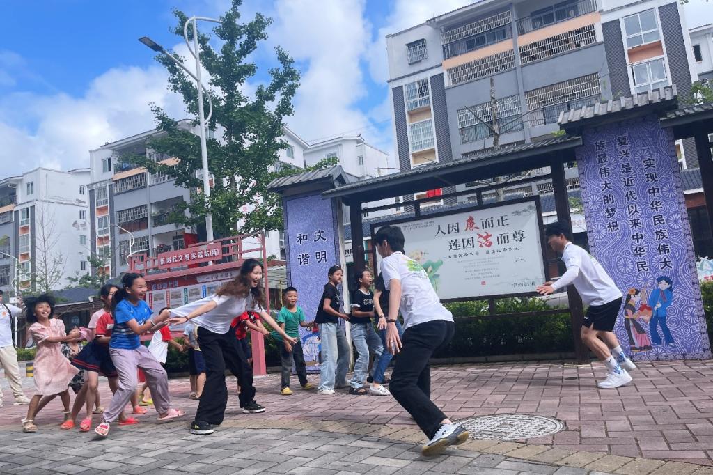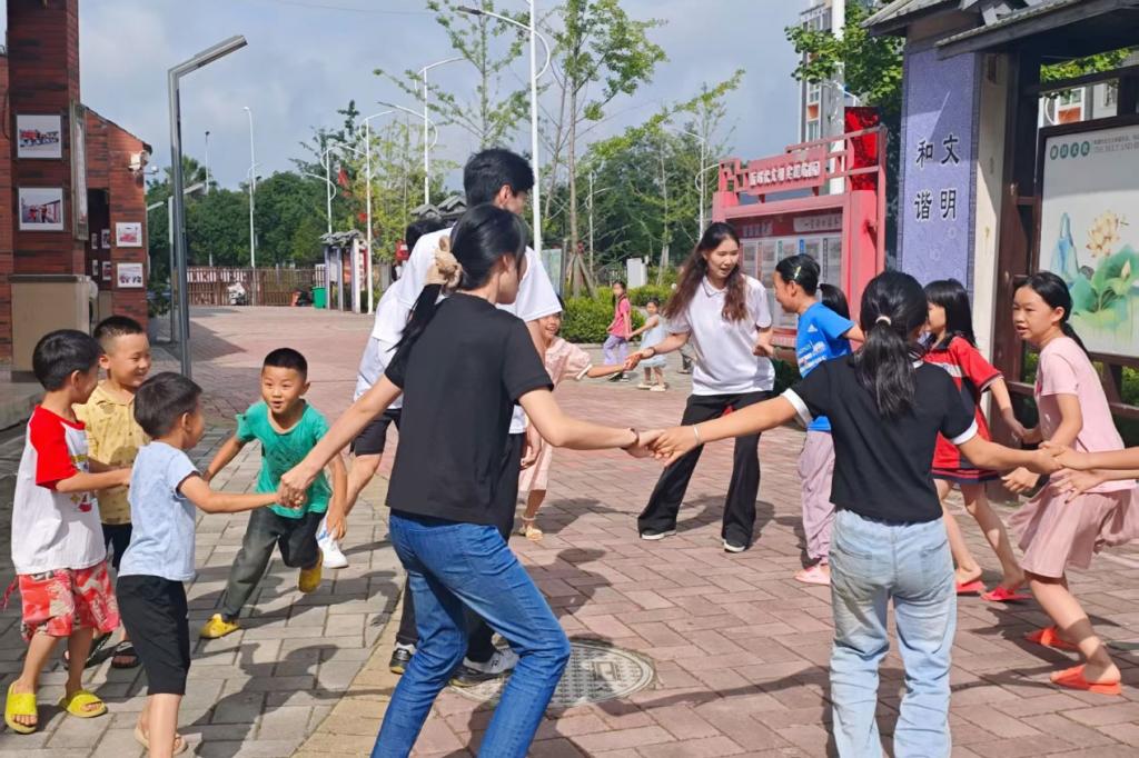 当天上午,团队成员们来到镇宁县异地扶贫搬迁街谐美社区“儿童之家”。在余老师的组织下,队员们与搬迁街的留守儿童玩起了 “老鹰抓小鸡”“桃花朵朵开” 等趣味游戏,现场充满了欢声笑语。