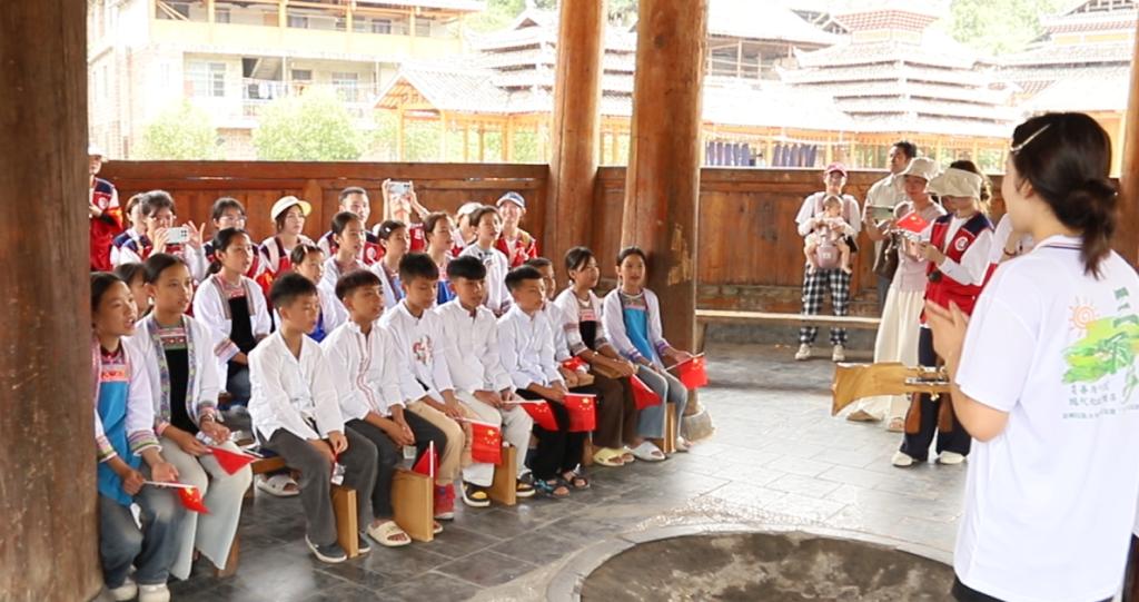 团队成员与小黄侗寨的小朋友们一起演唱《筑塘歌》和《侗家姑娘爱唱歌》