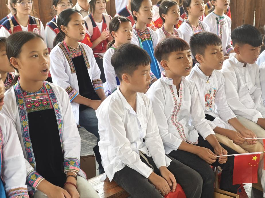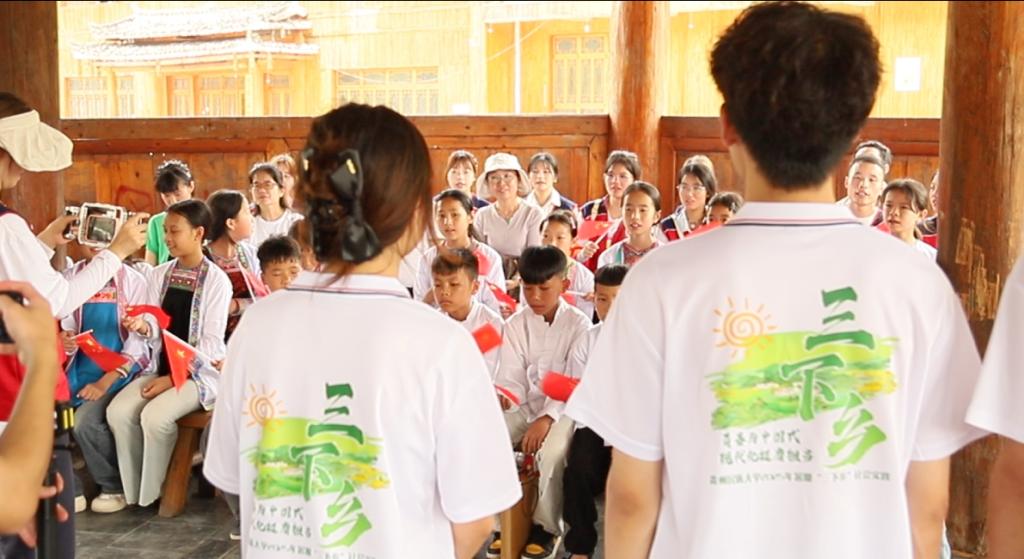 当实践团成员拿出提前准备好的歌单,教孩子们演唱侗语版《唱支山歌给党听》时,孩子们从好奇学念歌词,到练习几遍后能跟随旋律哼唱。其中,一名扎羊角辫的小姑娘学得最快,主动带领大家合唱。
