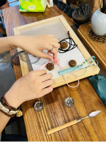 离开簸箕画工作室,循着一缕若有似无的清雅香气,团队沿着蜿蜒的石板路来到香坊。在清幽香气中了解传统制香技艺。从天然香料的选取、晾晒、研磨,到手工制香、晾晒成型,每一步都有严格要求。成员们亲身体验研磨香料、制作香牌,体会到技艺的精细及背后的香道文化——它与祭祀、养生、礼仪等生活场景紧密相连。