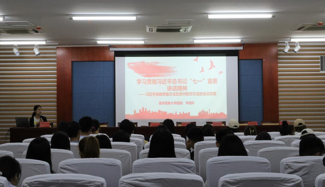 2021年9月17日下午6:30,贵州民族大学团委副书记李建玲同志在学生活动中心2001会议室,为校级学生组织干部进行以“学习贯彻习近平总书记‘七一’重要讲话精神——习近平战略思维方法在贵州脱贫攻坚的生动实践”为主题的学习教育专题宣讲。