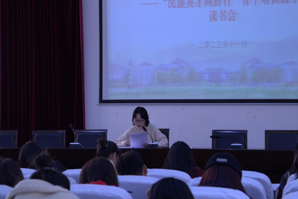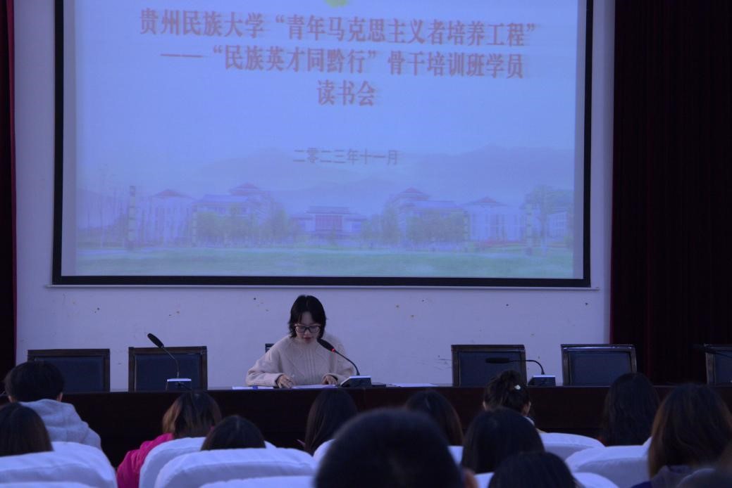 11月27日中午1点,贵州民族大学花溪校区“青年马克思主义者培养工程”—“民族英才同黔行”骨干培训班读书会在15栋圆形会议室召开。2023—2024学年“青年马克思主义者培养工程”—“民族英才同黔行”骨干培训班全体成员参加会议,会议共分为六个阶段,由校团委组织部助管陈倚卓主持会议。