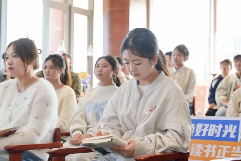 整场分享引经据典、旁征博引,既有理论高度的深刻阐释,又有生活智慧的生动传递,为在场师生带来了一场思想与精神的双重洗礼。学子们专注聆听、认真记录,不时点头呼应,现场气氛庄重而热烈,思想的火花在书香中悄然绽放。