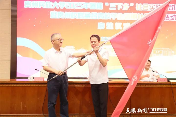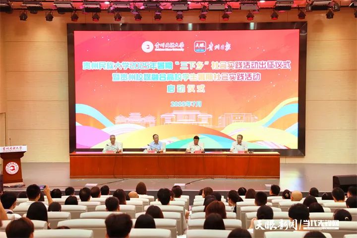 7月11日,贵州民族大学举办2025年暑期“三下乡”社会实践活动出征仪式,标志着贵州校媒融合高校学生暑期社会实践活动正式启动。教师代表、学生代表、媒体代表等200余人参加了出征仪式。