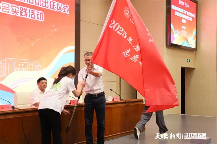 贵州日报报刊社副总编辑范朝权为贵州校媒融合实践队代表授旗