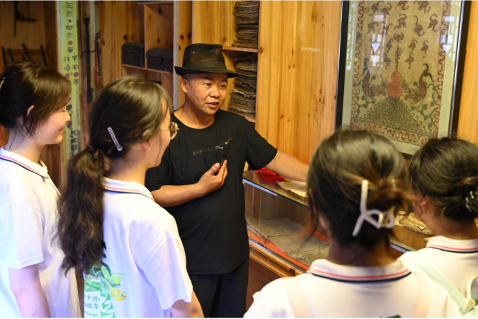 在韦家贵的带领下,队员们逐一参观了馆内的马尾绣、牛角雕刻、银饰、水书等藏品。他说道,面对外地商人的收购,始终坚持“不批量售卖”原则:“这些物件是水族的根,要让它们留在故土,传承下去。”