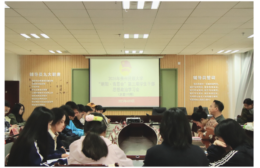 2026年4月3日,贵州民族大学第三期学生干部思想政治学习会在北校区颂雅楼1楼115会议室召开。校团委书记胡斌出席会议,校级学生组织负责人、各部门助理参会,社团代表列席。校团委社团部部长李萃主持会议。