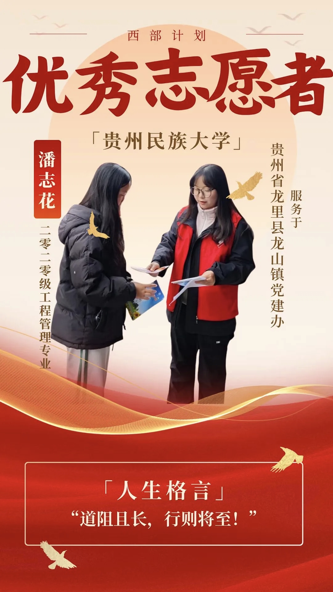 潘志花,贵州民族大学2020级工程管理专业毕业生,现服务于贵州省龙里县龙山镇党建办。潘志花同志在执行西部计划服务期间全身心投入党建办驻村干部管理、退休干部管理、团委、关工委工作。她在工作中主动作为,尽职尽责,先后获得龙山镇2024、2025年度“优秀职工”、2025年度“龙里县优秀共青团干部”等荣誉。