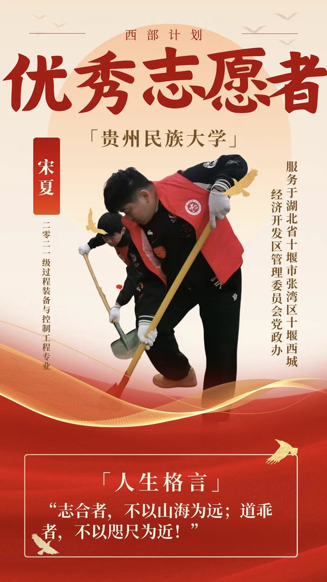 宋夏,贵州民族大学2021级过程装备与控制工程专业毕业生,作为西部计划志愿者,现服务于湖北省十堰市张湾区十堰西城经济开发区管理委员会党政办公室,兼任宣传干事。